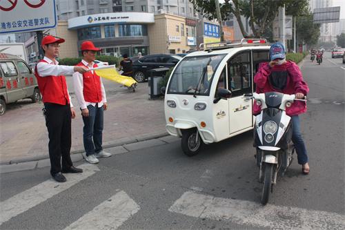 活動(dòng)地點(diǎn)位于郁州路與解放路十字路口。在十字路口,每位志愿者身穿志愿者紅馬夾,每?jī)扇艘唤M分布在四個(gè)交通路口。他們有的向行人講解交通規(guī)則,有的幫助老人、小孩等有秩序的按紅綠燈指示過(guò)馬路,有的對(duì)行人、非機(jī)動(dòng)車隨意橫穿馬路、闖紅燈等不文明行為進(jìn)行勸阻。整個(gè)活動(dòng)中,志愿者們盡職盡責(zé),有效的維護(hù)了十字路口的交通秩序。