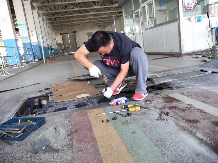 6月15號(hào),蘇港檢測(cè)站環(huán)檢車間3號(hào)線的底盤測(cè)功機(jī)皮帶導(dǎo)向滾筒軸壞了,導(dǎo)致測(cè)功機(jī)傳動(dòng)皮帶斷裂,環(huán)檢汽油線尾氣不能檢測(cè)。恰逢周六休息時(shí)間,如果當(dāng)天不能維修好,勢(shì)必會(huì)嚴(yán)重影響星期一的檢測(cè)效率。檢測(cè)站立即啟動(dòng)應(yīng)急預(yù)案,經(jīng)過黨員示范崗陳明同志帶領(lǐng)著葉舟等人進(jìn)行設(shè)備搶修,搶修過程中,由于設(shè)備老舊,好多螺絲都已經(jīng)銹蝕的無(wú)法擰動(dòng),陳明用戦子一點(diǎn)一點(diǎn)鑿開了螺絲,趴在地上才把滾筒軸卸下來(lái),然后又重新?lián)Q好了新的設(shè)備。