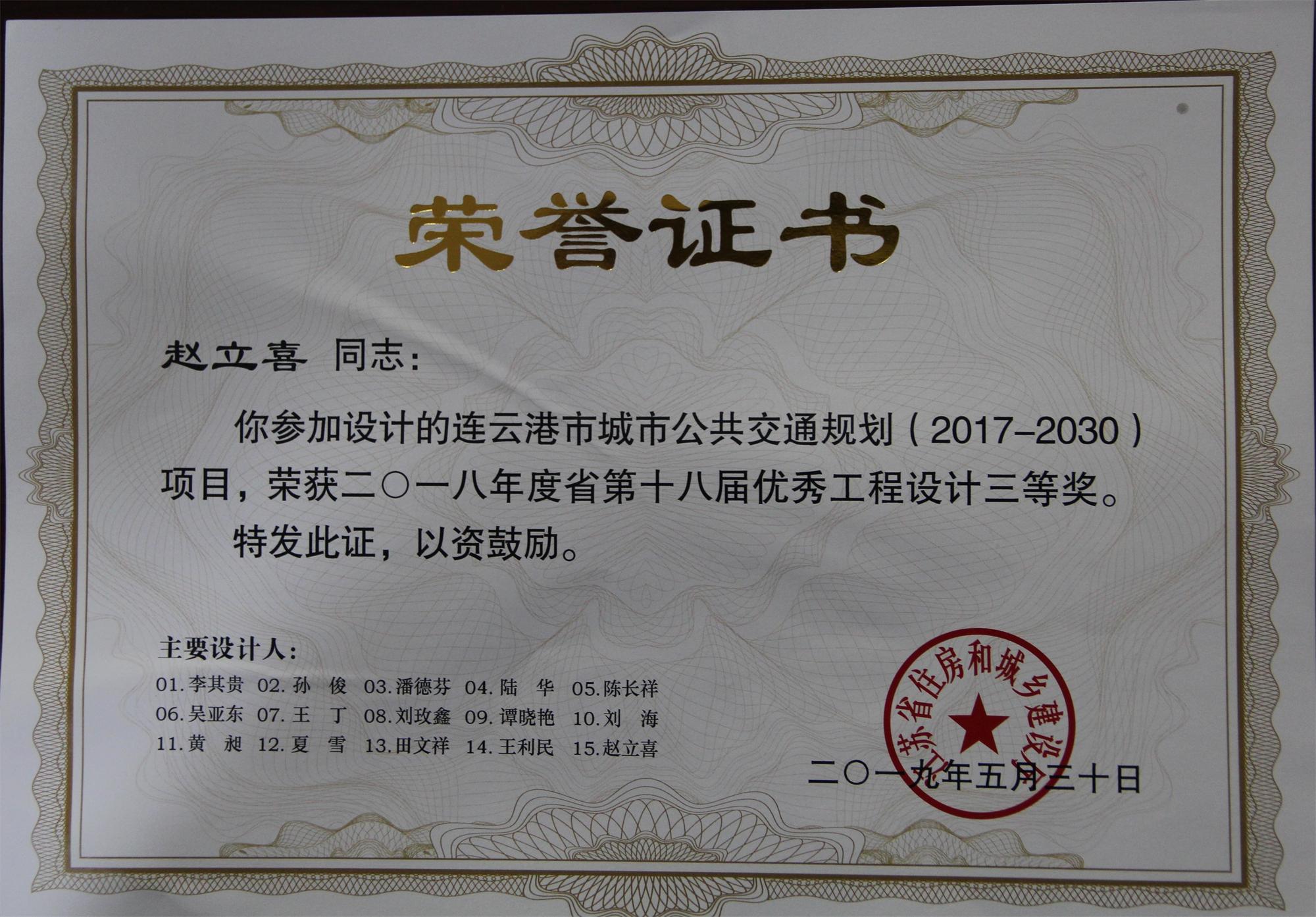 近日,從江蘇省住房和城鄉(xiāng)建設(shè)廳獲悉,汽服公司副總經(jīng)理趙立喜參加設(shè)計的連云港市城市公共交通規(guī)劃(2017-2030)項目,被省住房和城鄉(xiāng)建設(shè)廳評選為2018年度省第十八屆優(yōu)秀工程設(shè)計三等獎。