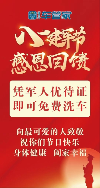 有一種擔(dān)當(dāng),叫保家衛(wèi)國;有一種奉獻(xiàn),叫戎馬丹心。值此“八一”建軍節(jié)來臨之際,汽服公司“連e行”車管家以“紅色傳承 迎八一”為主題,特別推出擁軍專屬活動(dòng)——用細(xì)致服務(wù)致敬軍魂,以實(shí)際行動(dòng)傳承紅色基因,向每一位現(xiàn)役、退役軍人致以最崇高的敬意,讓尊崇與溫暖直抵心間。