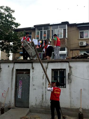 新西社區(qū)是一個(gè)舊式居民區(qū),由于沒有物業(yè)管理,居民區(qū)內(nèi)衛(wèi)生狀況較差,衛(wèi)生死角、屋頂上的違章建筑較多,志愿者們搬來梯子,拿著鐵鉗爬上屋頂,清理了屋頂?shù)拇u頭瓦塊和廢棄垃圾,并集中對堆放的垃圾清運(yùn)干凈。在活動(dòng)現(xiàn)場,志愿者們還幫助社區(qū)清理居民庭院,將一些枯樹和存在危險(xiǎn)因素的樹木修剪和加固。