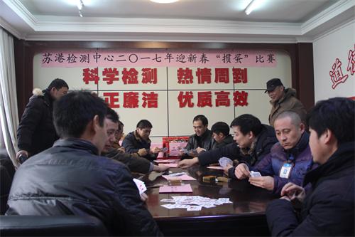 2017年1月25日下午,檢測中心領(lǐng)導(dǎo)班子、一線職工約30人,在不影響生產(chǎn)的情況下,在檢測中心內(nèi)部舉行迎新春“摜蛋”比賽活動。