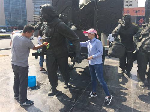 下午三點(diǎn),參加活動(dòng)的志愿者們按時(shí)來到了位于華聯(lián)的雷鋒車城市雕塑前,如火如荼的開始了衛(wèi)生清潔工作。打掃過程中,志愿者們頂著炎炎烈日,有的拖地,有的擦拭雕塑,經(jīng)過了將近2個(gè)小時(shí)的清掃,渾身汗流浹背,但看著越發(fā)干凈的雕塑和周圍地面,紛紛露出了開心的笑容。