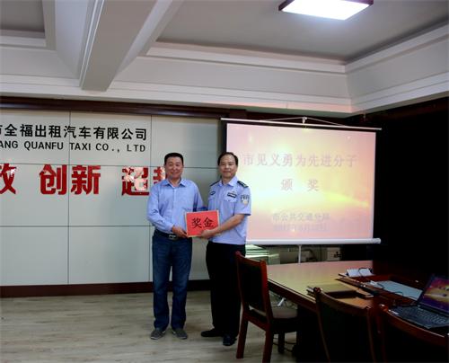 6月27日下午,市公共交通分局局長(zhǎng)張思山一行三人到全福出租汽車公司看望慰問的哥潘振銀,并為潘振銀帶來了市見義勇為先進(jìn)分子獎(jiǎng)金。張局長(zhǎng)對(duì)潘振銀同志見義勇為、熱心社會(huì)公益事業(yè),為社會(huì)責(zé)任的擔(dān)當(dāng)所做出的努力給予了高度評(píng)價(jià)。